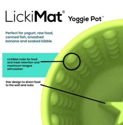 De Yoggie Pot is geschikt voor alle soorten voedsel: nat, rauw, barf en geweekte brokjes. Droge brokjes kunnen worden gebruikt wanneer ze worden gemengd met yoghurt of soortgelijk huisdierveilig voedsel. Geschikt voor gebruik met kaas, sardines, bessen, smoothies, vistraktaties en meer. Deze LickiMat-hondeninnovatie bevat een half kopje rauw voedsel en is een perfecte interactieve voerbak en gezonde afleider.
